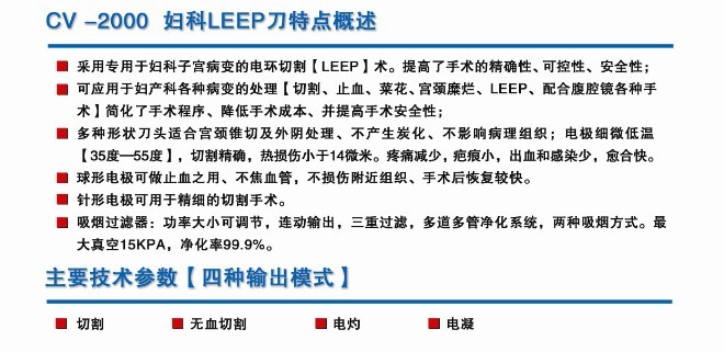 康威CV-2000婦科環(huán)切LEEP刀采用專用于婦科子宮病變的電環(huán)切割(LEEP)術(shù)。提高了手術(shù)的精確性、可控性、安全性;